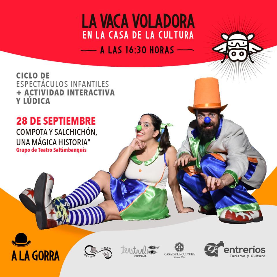 Este sábado a las 16.30, se podrá disfrutar de una nueva fecha del ciclo La Vaca Voladora, que nuclea a grandes y chicos en Casa de la Cultura de Entre Ríos. En esta oportunidad habitará la casa el Grupo de Teatro Saltimbanquis con su espectáculo: “Compota y Salchichón, una mágica historia”. Actividad con entrada libre y salida a la gorra.