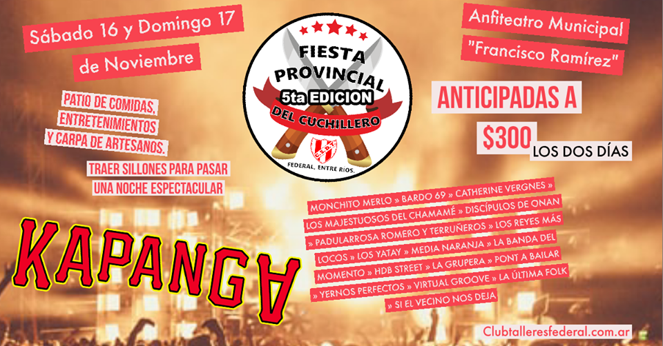 La Fiesta Provincial del Cuchillero se desarrollará del 16 y 17 de noviembre en Federal, con gran variedad de artesanías y una entrada accesible. Será en el Anfiteatro Pancho Ramírez, y tendrá su cierre musical de la mano de Kapanga.