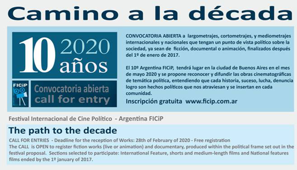 El 10º Argentina FICiP, tendrá lugar en la ciudad de Buenos Aires en el mes de mayo 2020, y se propone reconocer y difundir las obras cinematográficas de temática política, entendiendo que cada historia, suceso, lucha, denuncia o logro son hechos políticos que nos atraviesan y se insertan en cada comunidad.