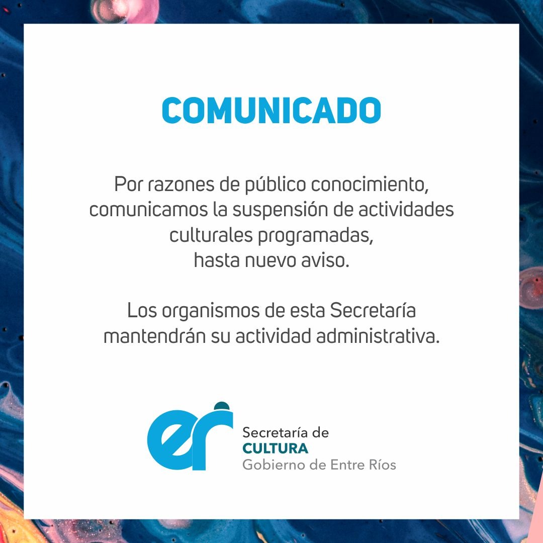 Desde el gobierno provincial, se anunció la suspención de las actividades culturales para la provincia de Entre Ríos; por causas de público conocimiento.