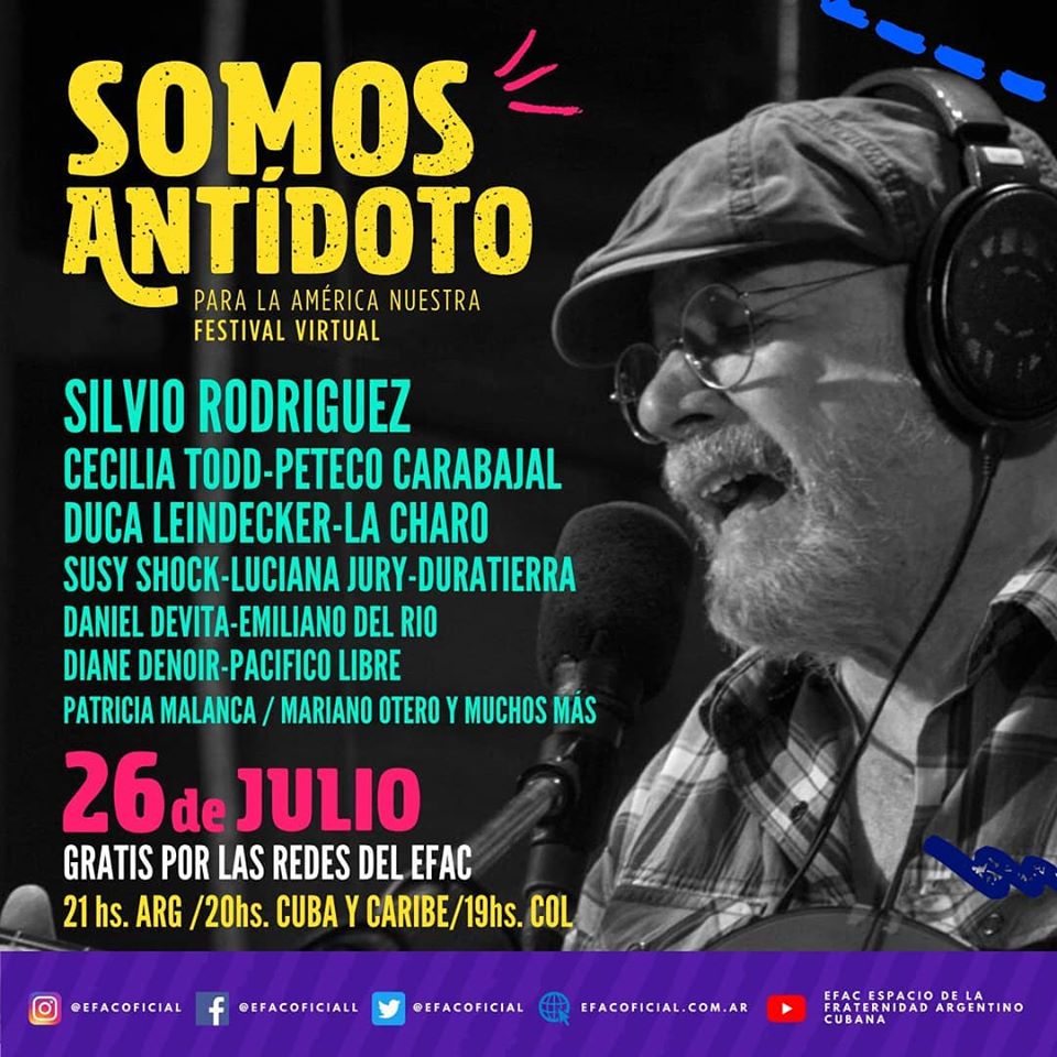 Este domingo a las 21 y por redes sociales, se llevará adelante el Festival Virtual Latinoamericano “Somos Antídoto”, del que participarán figuras como Silvio Rodríguez, Rubén Rada, Susy Shock, Cecilia Todd, Bahiano y Peteco Carabajal.