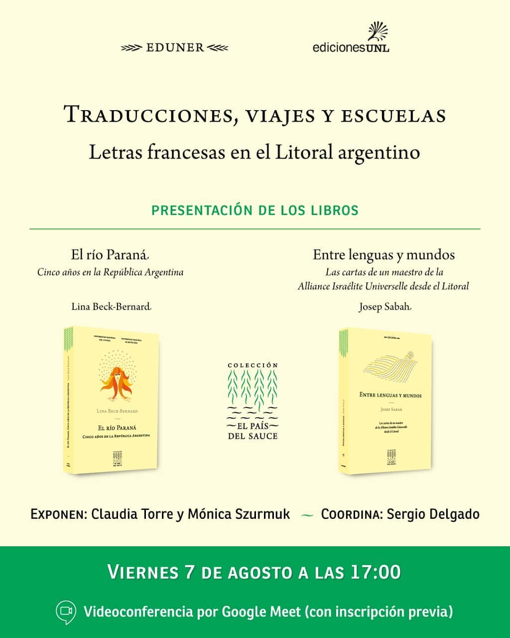 El encuentro llamado "Traducciones, viajes y escuelas. Letras francesas en el Litoral argentino", será a través de la plataforma Meet -con previa inscripción- y contará con la exposición de Claudia Torre (coordinadora de edición de "El río Paraná. Cinco años en la República Argentina") y Mónica Szurmuk (coordinadora de edición de "Entre lenguas y mundos. Las cartas de un maestro de la Alliance Israélite Universelle desde el Litoral") ; y la coordinación de Sergio Delgado. ⠀
