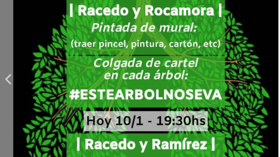 "Autoconvocadxs en Defensa del Espacio Verde y Arbolado de Bulevar Racedo", realizarán intervenciones artísticas bajo los lemas "No a la tala de árboles", "No al ensanche" y "Cuidémonos entre todos", en repudio a la obra de ensanche y doble vía de Bv. Racedo. Será a partir de las 18 en Bv. Racedo y Rocamora.