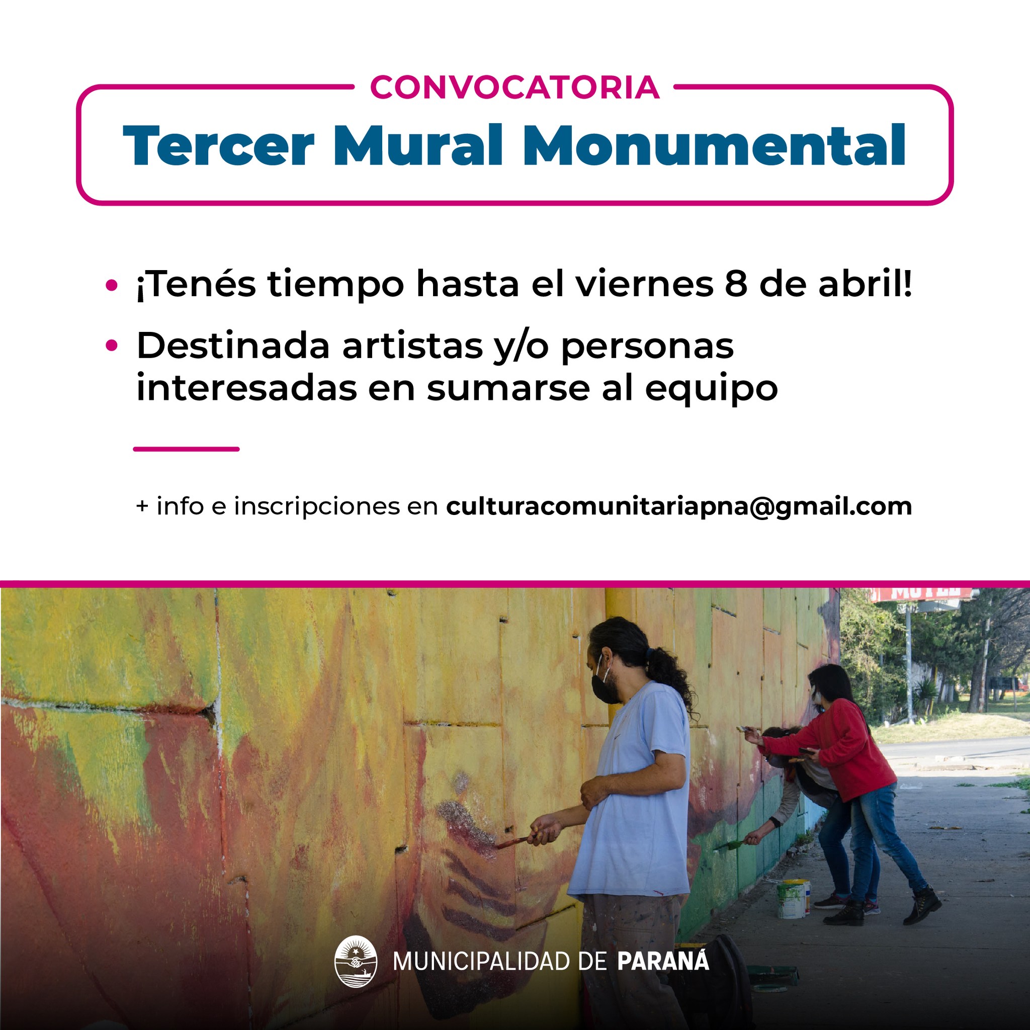 La Municipalidad de Paraná abre la convocatoria a artistas plásticos de la ciudad para ser parte de la creación de un "Mural Monumental" que se hará en inmediaciones de Circunvalación y Ruta 168. La coordinación artística y de trabajo estará a cargo de Florencia Albornóz