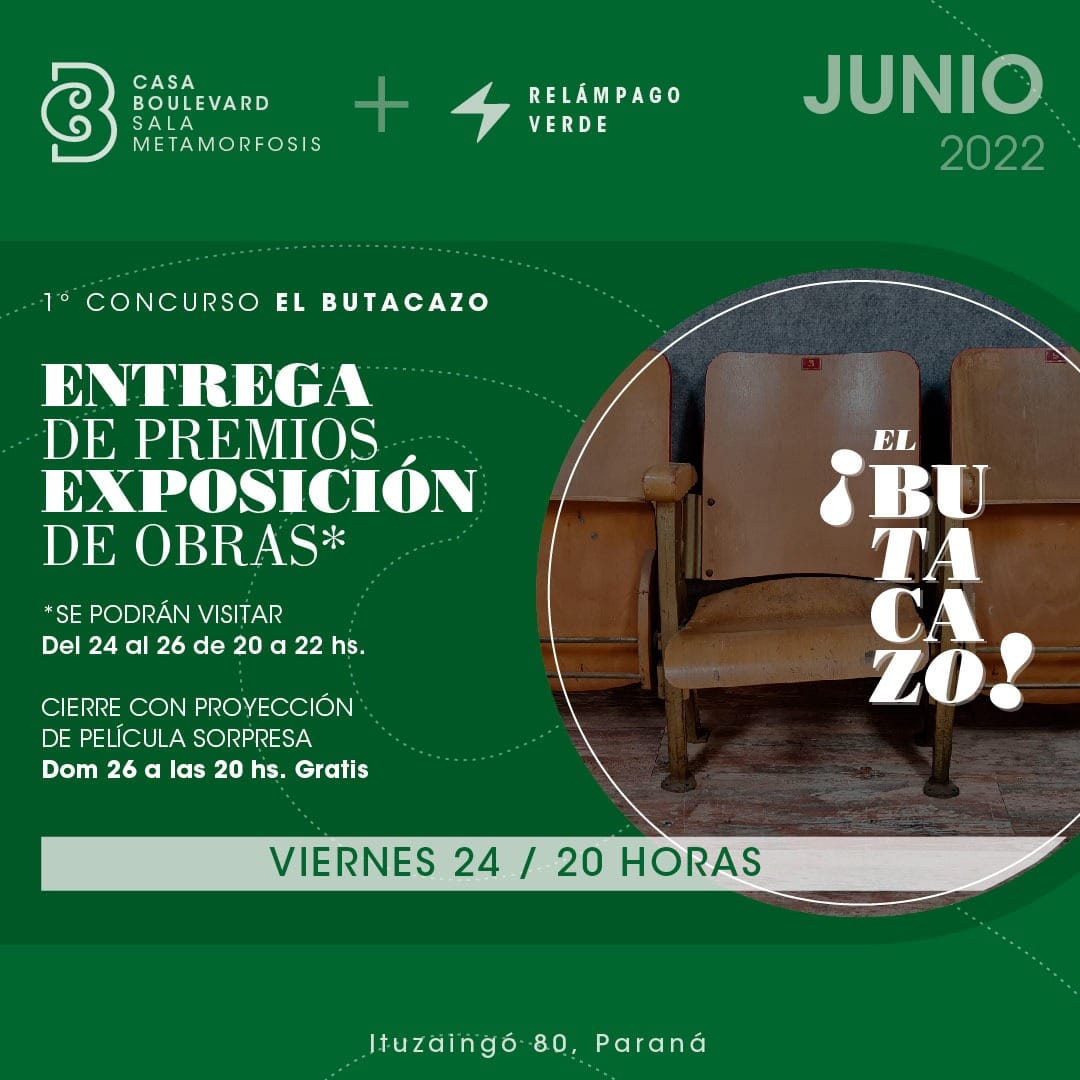 El concurso "El Butacazo" llegó a su fin y ya tiene a sus ganadores. El certamen organizado por el Centro Cultural Casa Boulevard/Sala Metamorfosis y el colectivo cinéfilo Relámpago Verde invita a toda la comunidad a participar de la entrega de premios y muestra que tendrá lugar el viernes 24 de junio desde las 20.