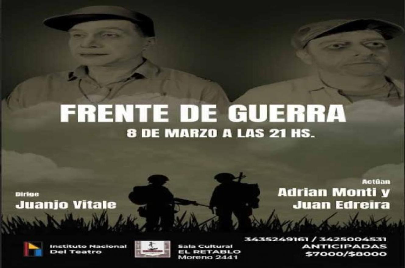 La cita para el sábado a las 21 horas es la puesta en escena de la obra de teatro “Frente de Guerra”, de Pablo Albarello.