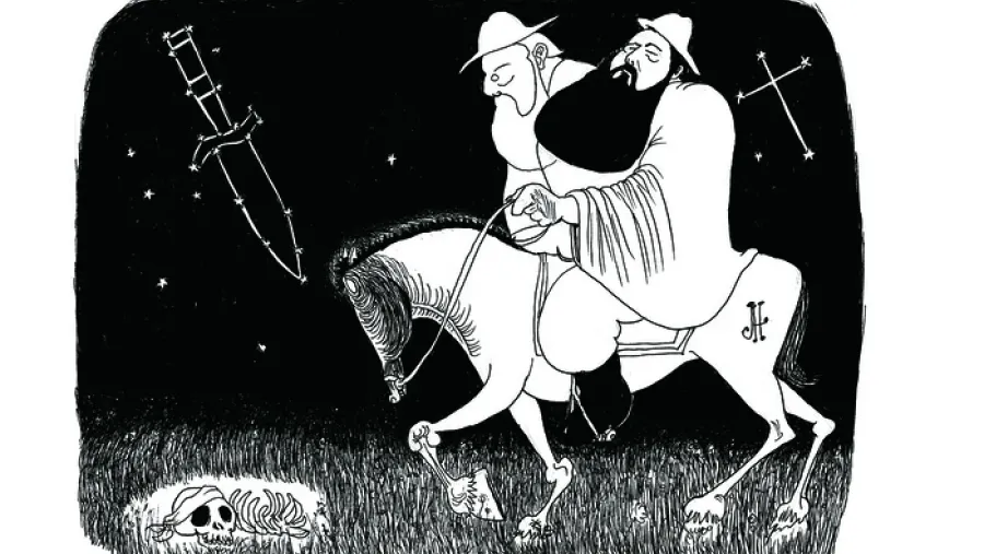 La primera imagen, a página completa, presenta a un gaucho de perfil cabalgando con su guitarra colgada, como si avanzara hacia el corazón del libro o hacia la consolidación de su propia leyenda. Un poco más adelante, una doble página impactante muestra a José Hernández a caballo, desdoblado y escoltado por sí mismo, en una noche pampeana atravesada por una constelación en forma de daga, con una calavera con vincha tendida en el campo, y un cielo marcado por la Cruz del Sur.