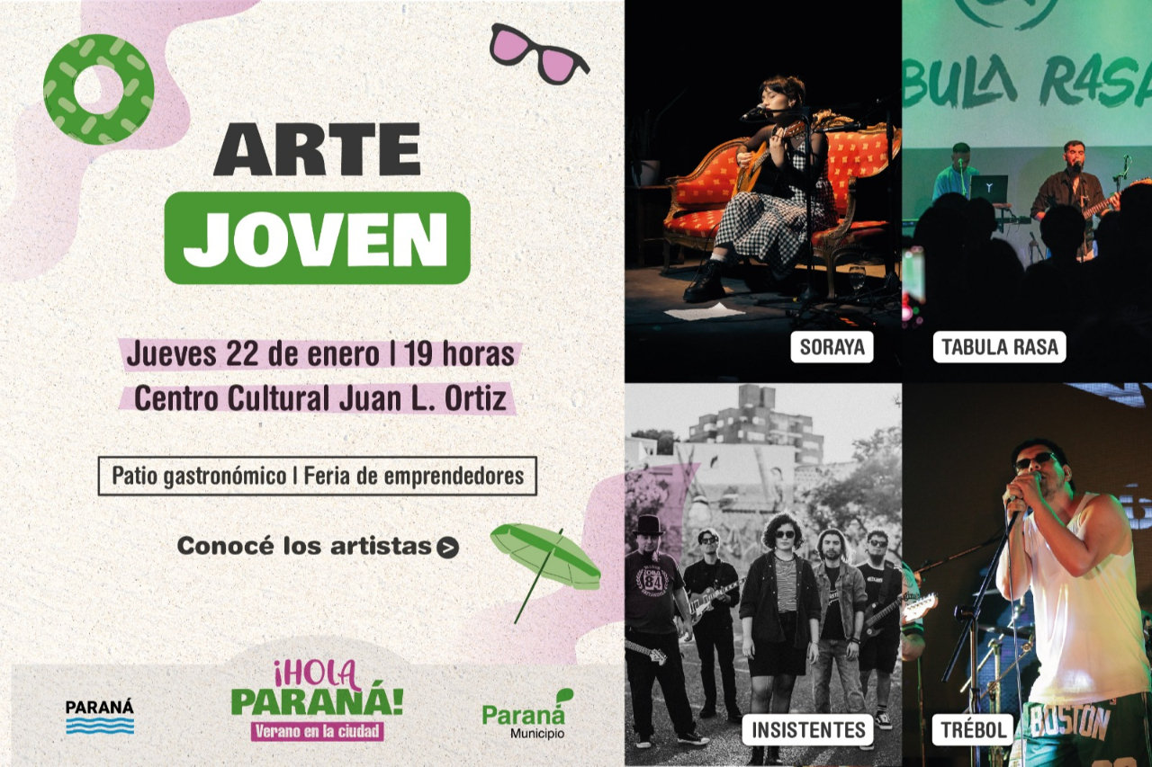 Este jueves a las 19, en el Centro Cultural Juan L. Ortiz, se realizará la primera edición de Arte Joven, con acceso libre. Es organizada por la Municipalidad de Paraná, destinada a las juventudes y combina música en vivo, patio gastronómico y feria de emprendedores jóvenes.