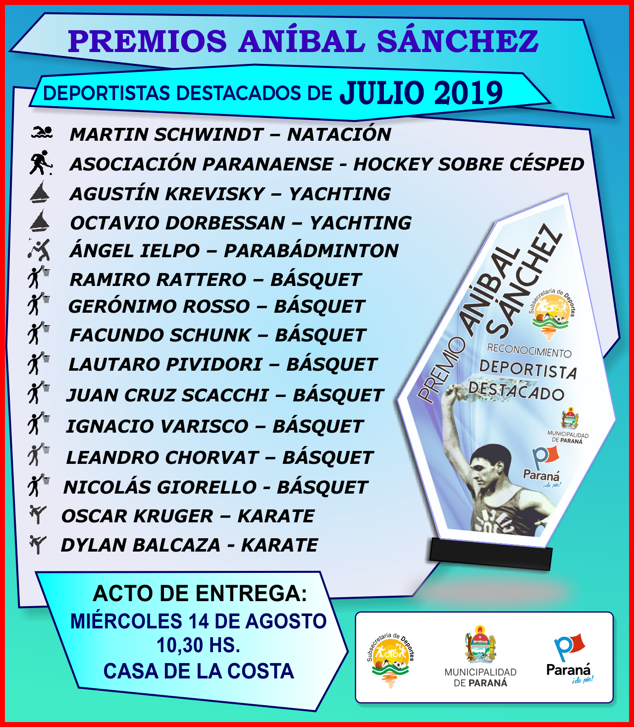 Una nueva entrega de los Premios "Aníbal Sánchez" se concretará este miércoles, a partir de las 10.30, en la Casa de la Costa del Paraná. En esta oportunidad, serán distinguidos los deportistas locales que se destacaron durante el pasado mes de julio.