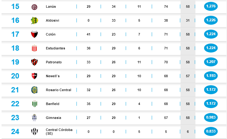 A partir de esto es que si el torneo finalizara hoy, el promedio dejaría al Taladro y el Canalla en un duelo para definir quién de los dos desciende. En tanto que el Lobo platense y el Ferroviario los siguen más relegados dentro de los puestos que otorgan el descenso a la Primera Nacional.