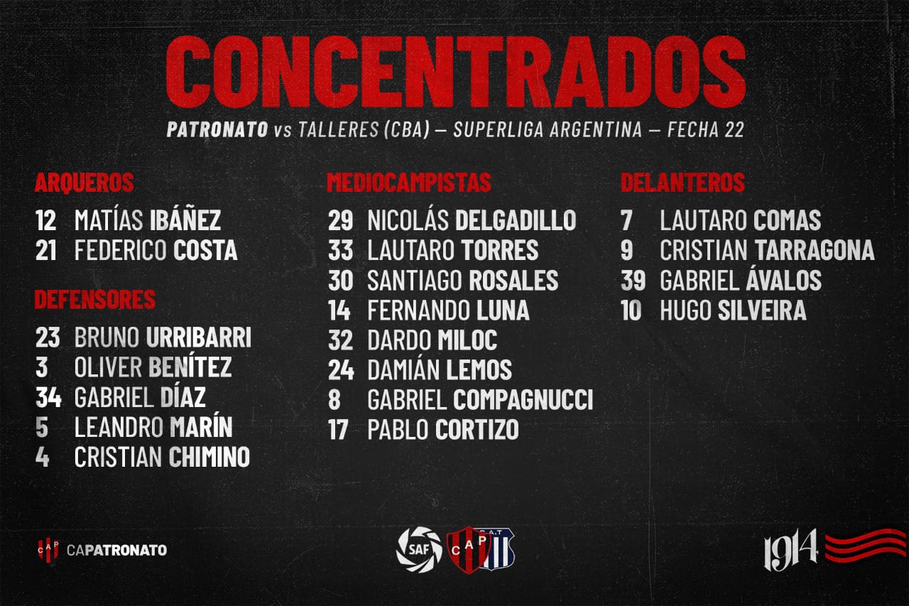 El entrenador de Patronato anunció el listado de 19 futbolistas que concentrarán para el partido ante Talleres. Se prevé que en el encuentro ante la T aparezca el mismo once que empató ante Argentinos Juniors. El partido será este lunes, desde las 19.