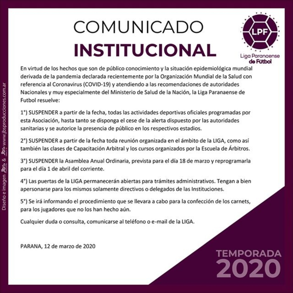 En sintonía con lo realizado por el básquet provincial y otros estamentos del deporte y la cultura a nivel nacional, la Liga Paranaense de Fútbol decidió suspender actos y eventos organizados para lo que resta de marzo y, a la vez, suspender indefinidamente el inicio del campeonato.