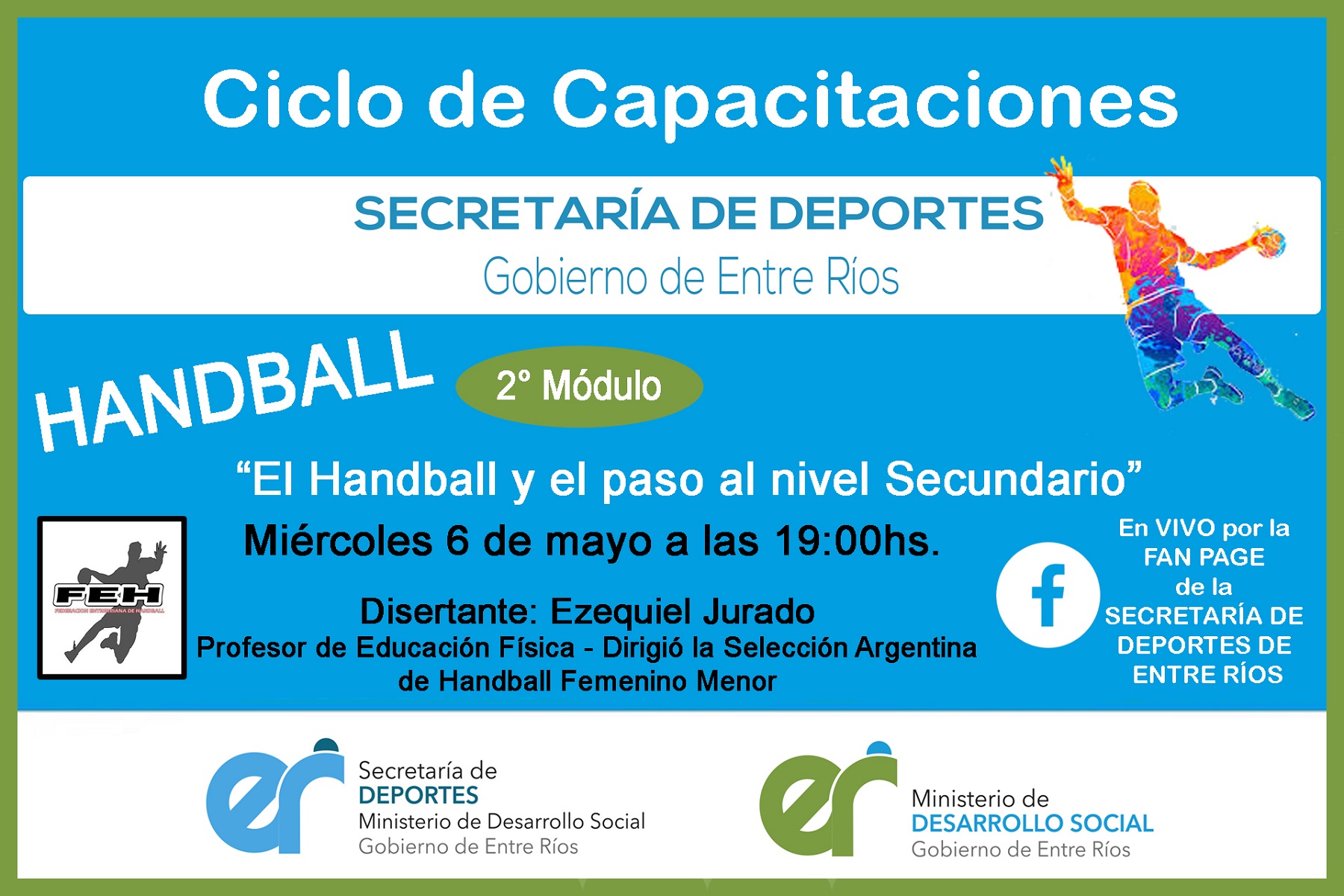 En la continuidad del “Ciclo de Capacitaciones en Deportes de Conjunto”, la Secretaría de Deportes ofrecerá para este miércoles, desde las 19, el segundo módulo de Handaball, que tendrá como disertante al profesor Ezequiel Jurado y la temática propuesta será el “El Handball y el paso al nivel Secundario”.