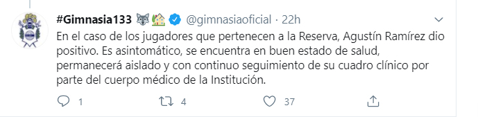 El juvenil futbolista entrerriano Agustín Ramírez dio positivo de coronavirus luego de los testeos realizados el pasado sábado en el predio de Estancia Chica de Gimnasia y Esgrima La Plata, donde se desempeña como integrante del equipo selectivo de la Reserva.