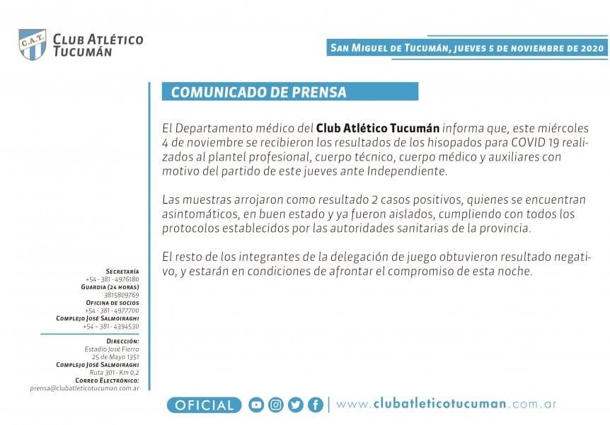 A pocas horas de recibir a Independiente por la vuelta de los 16avos de final de la Copa Sudamericana, Atlético Tucumán informó que detectó dos casos positivos de Coronavirus en su delegación -plantel, cuerpo técnico, cuerpo médico y auxiliares- luego de los test PCR que realizó el pasado lunes por reglamentación de la Conmebol.