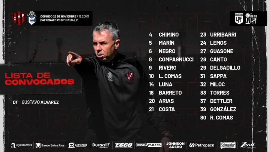 Gustavo Álvarez entregó la nómina de futbolistas que serán parte del duelo entre Patronato y Gimnasia de La Plata. El Patrón buscará sumar por primera vez en la Copa de la Liga Profesional este domingo, desde las 19.20.
