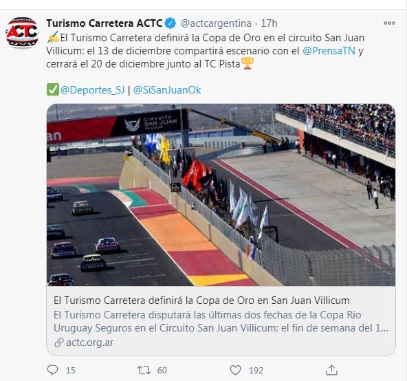 El Turismo Carretera disputará las últimas dos fechas de la Copa de Oro en el Circuito San Juan Villicum. Las competencias se llevarán adelante el fin de semana del 13 de diciembre donde compartirá escenario con el Turismo Nacional. El TC disputará la penúltima fecha y el TN definirá su campeonato 2020.