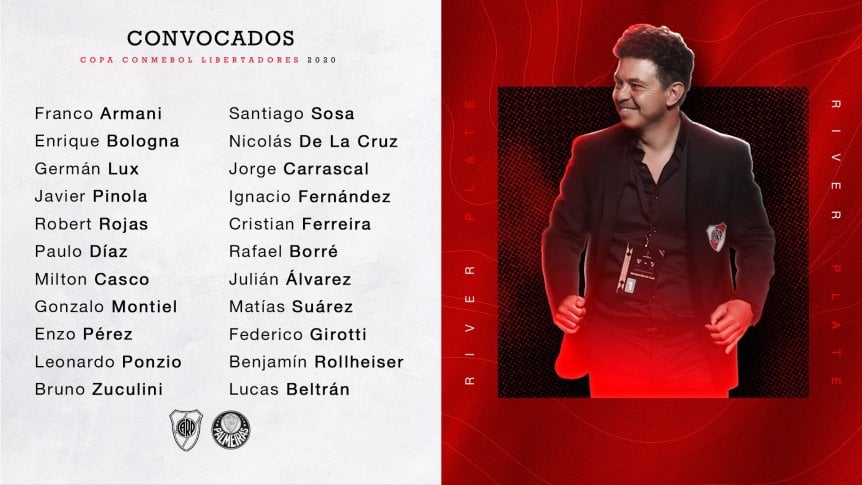 Con respecto a los 23 convocados por Gallardo para lo que terminó siendo 2-2 ante Boca en el Superclásico, además del ingreso de Casco, las novedades son las bajas de los juveniles Elías López y Augusto Aguirre, que estuvieron en el banco en La Bombonera.