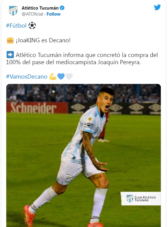 Atlético Tucumán oficializó la compra del paranaense Joaquín Pereyra. De esta manera, el Decano hizo uso de la opción de compra y adquirió el pase del volante que fue una de las figuras del equipo tucumano en la Liga Profesional de Fútbol 2022. A través de sus redes sociales, la institución tucumana informó la adquisición de la totalidad de la ficha del mediocampista.