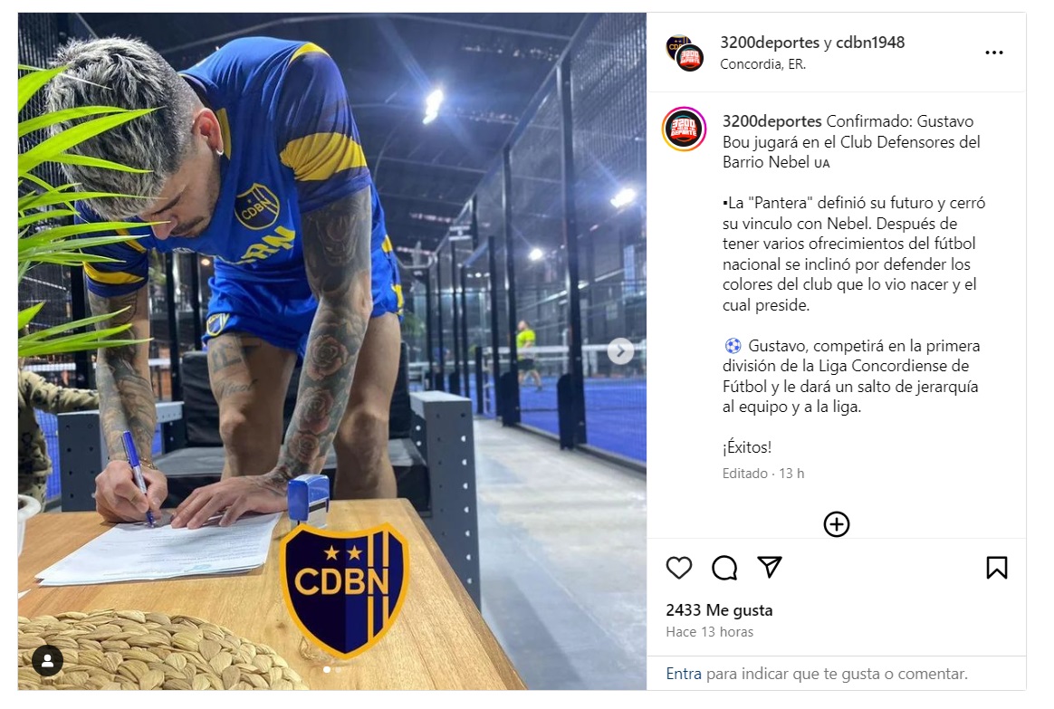 El entrerriano Gustavo Bou volverá a jugar en la entidad que lo vio nacer como futbolista: Club Defensores del Barrio Nebel. En las últimas horas, la Pantera sacudió el fútbol de la Capital Nacional del Citrus ya que subió a sus redes sociales la firma del contrato que lo ligara con la institución de sus amores.