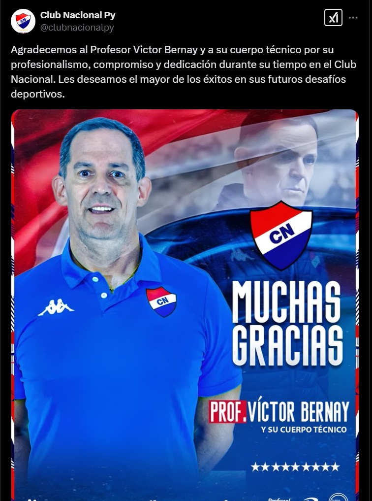 “Agradecemos al profesor Víctor Bernay y a su cuerpo técnico por su profesionalismo, compromiso y dedicación durante su tiempo en el Club Nacional. Les deseamos el mayor de los éxitos en sus futuros desafíos deportivos”, expresó en sus redes sociales la entidad paraguaya.