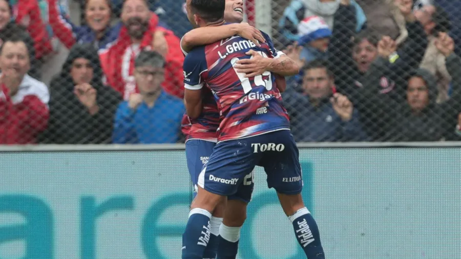Gamba y Palacios se abrazan: entre los dos anotaron el gol que le dio el triunfo a Unión.