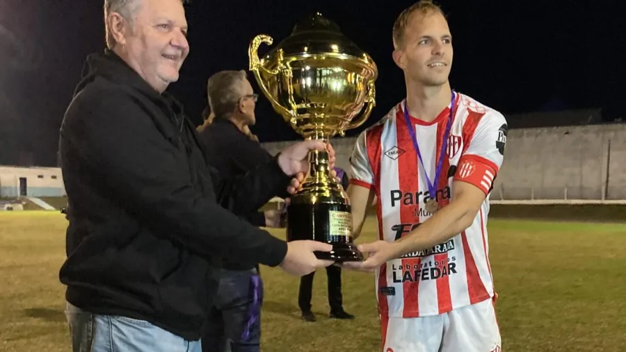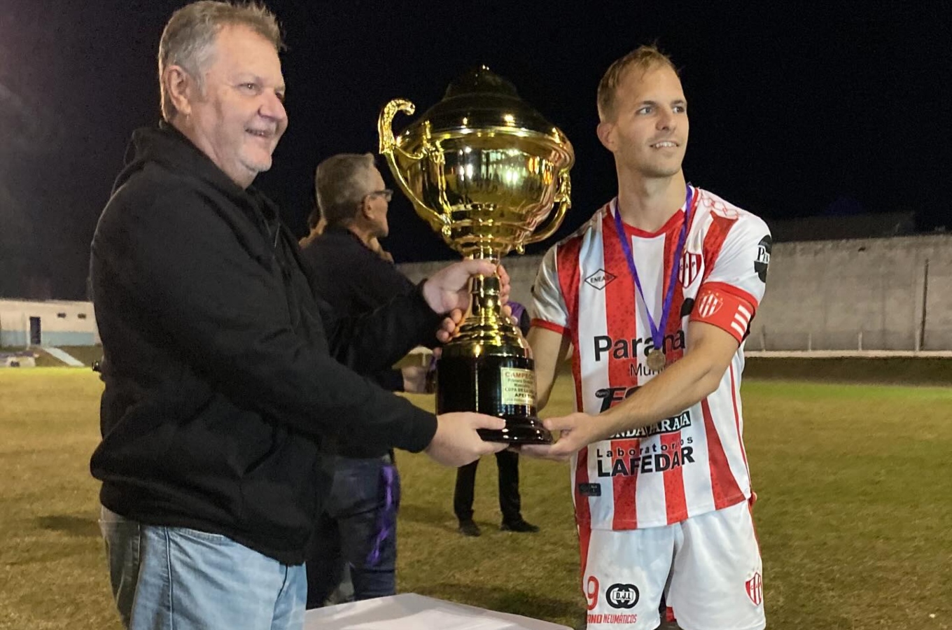 Leonel Bolzán (Atlético Paraná) recibe la copa por parte de Alejandro Schneider (Foto: Minuto LPF).