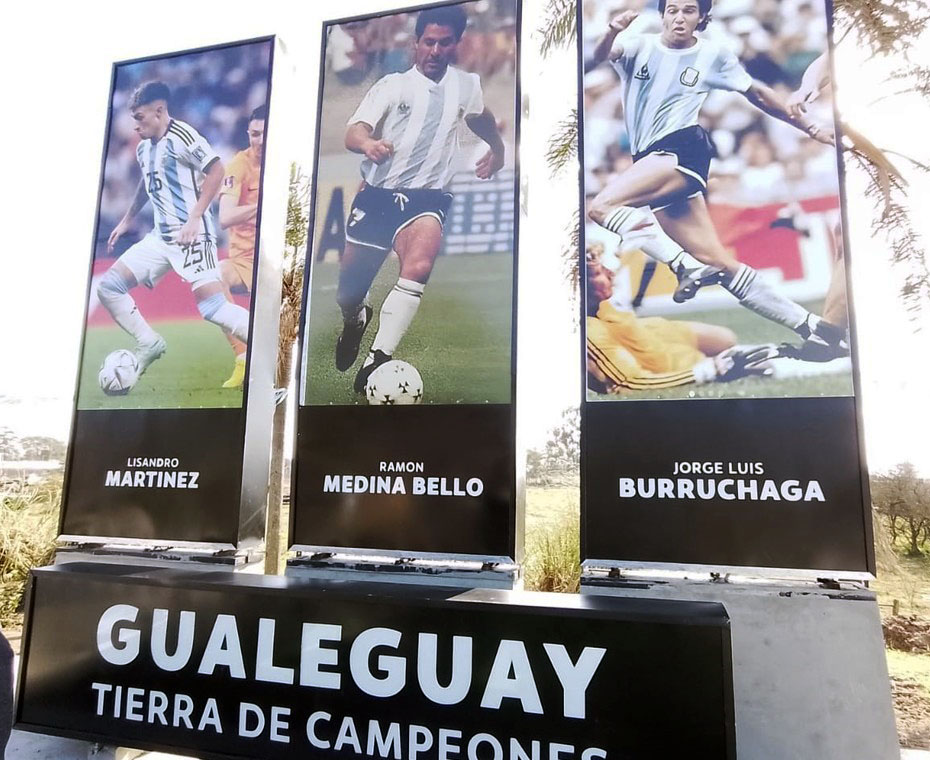 En un emotivo acto, Gualeguay inauguró gigantografías en homenaje a Jorge Burruchaga, Ramón Ismael Mencho Medina Bello y Lisandro Martínez, tres futbolistas nacidos en la ciudad que se consagraron campeones con la selección argentina de fútbol. Las imágenes, ubicadas en el acceso a la localidad, rinden tributo a sus logros deportivos y a su orgullo gualeyo.