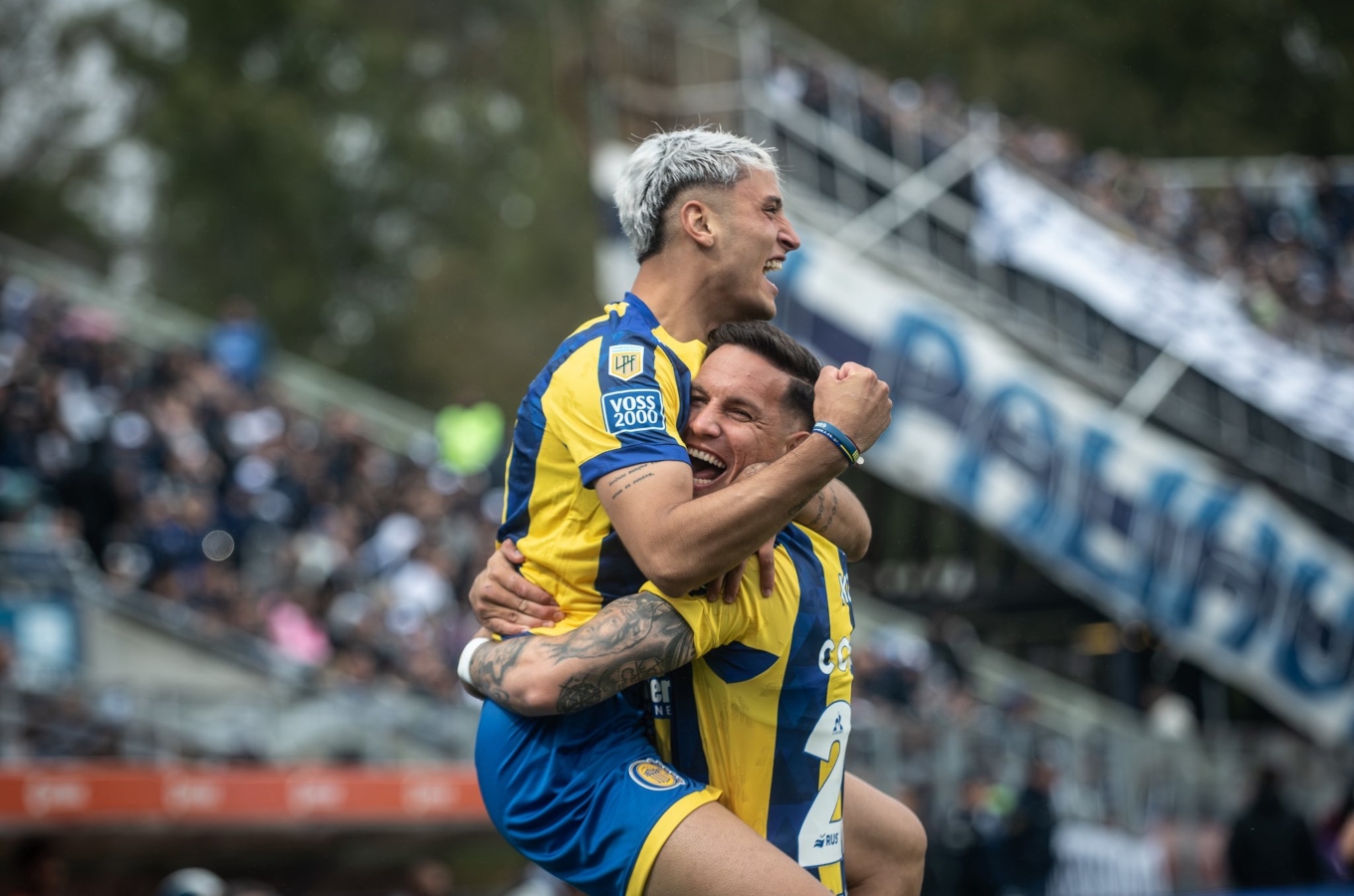 Alejo Véliz y Enzo Copetti celebran el primer gol del "Canalla".