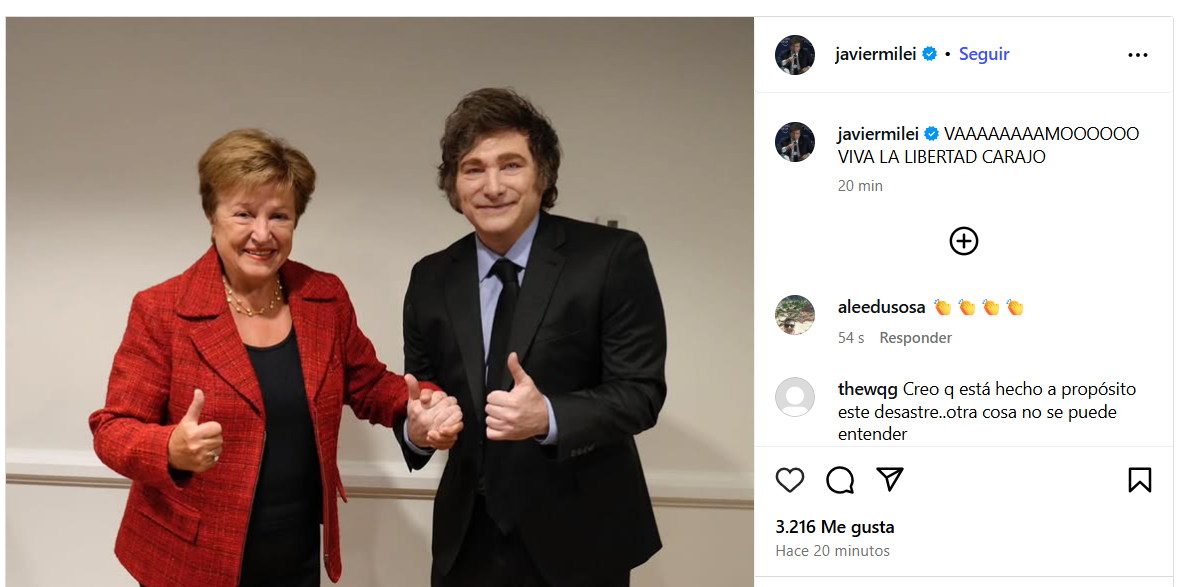 El Fondo Monetario Internacional (FMI) informó en la tarde de este jueves que el staff técnico del organismo llegó a un acuerdo con las autoridades argentinas sobre la primera revisión del programa de facilidades extendidas. Sujeto a la aprobación del Directorio de la entidad, este entendimiento desbloquea el acceso potencial a alrededor de u$s2.000 millones. El anuncio fue celebrado por el presidente Javier Milei, quien posteó en su Instagram una foto junto a Kristalina Georgieva, titular del organismo internacional. "VAAAAAAAAMOOOOOO VIVA LA LIBERTAD CARAJO", afirmó en la publicación.