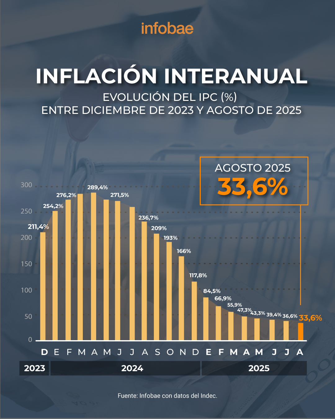 Tal como estimaban las consultoras privadas, la inflación de agosto fue de 1,9% y acumuló un 33,6% en los últimos doce meses, según informó el Indec. A su vez, el acumulado de los ocho meses del 2025 refleja un alza de precios del 19,5%. El número de julio también había ascendido a 1,9%, lo que muestra que en agosto la tendencia inflacionaria se mantuvo.
