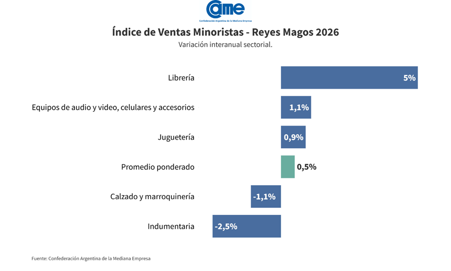 Las ventas de los comercios minoristas pymes por la llegada de los Reyes Magos 2026, crecieron 0,5% frente a la misma fecha de 2025, medidas a precios constantes.
