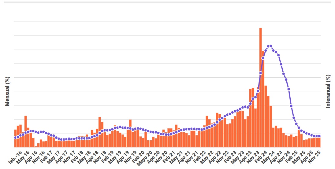 Entre enero y noviembre de 2025, el índice acumulado alcanzó 27,9% en todo el territorio nacional. Incluso si el dato de diciembre llegara a 3%, el incremento anual se ubicaría en 31,7%. Así, 2025 cerraría con la inflación más baja desde 2017.