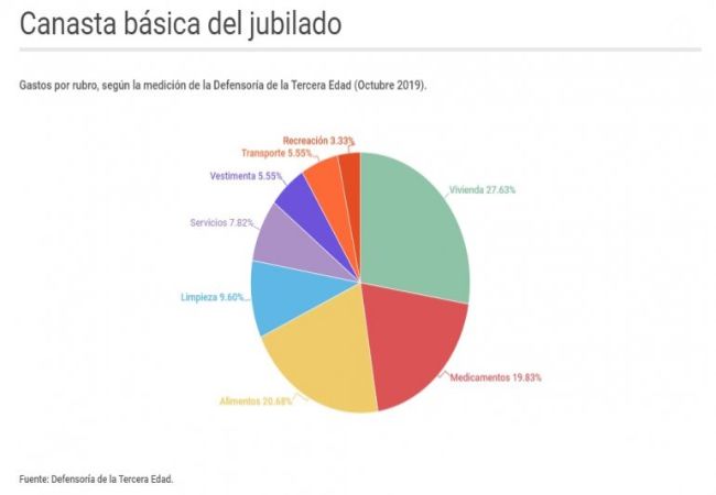 La canasta que releva la Defensoría de la Tercera Edad está compuesta principalmente por los gastos en vivienda, alimentos y medicamentos, aunque también incluye pago de servicios, recreación, vestimenta, transporte y limpieza.