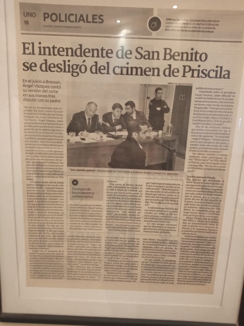 El juicio oral contra Facundo Bressán se inició en agosto de 2015. Lo llevó adelante la Sala I del Tribunal, integrada por los jueces José María Chémez, Miguel Ángel Giorgio y Elvio Garzón. Había una lista de 70 testigos, pero fueron menos los convocados finalmente y varios abogados, entre querellantes y defensores. Uno de los citados a declarar era el entonces intendente de San Benito, Angel Vázquez, por un extraño episodio sucedido esa noche del crimen. Los familiares de Priscila Hartman se ubicaron en las primeras butacas. Eran la imagen del dolor y la impotencia. Pero querían mirar de cerca a quien era acusado de asesino y feminicida.