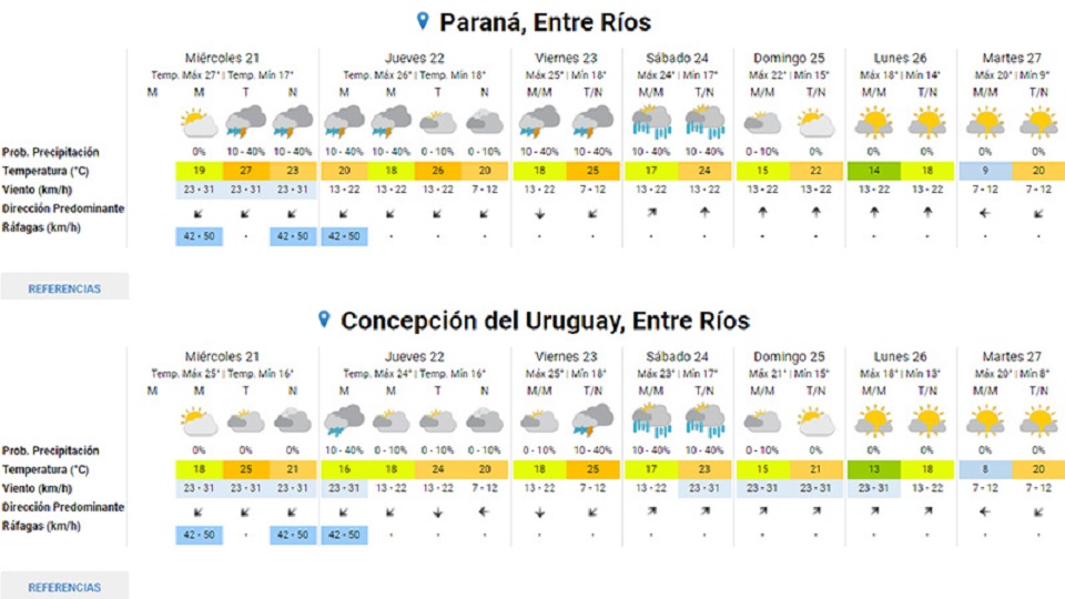 En el caso de Entre Ríos el tiempo se inestabilizará sobre todo en el oeste provincia, pudiendo generarse algunas precipitaciones. La probabilidad de lluvias, aunque sea dispersas, se mantendrá hasta el sábado, con un gradual descenso de la temperatura. Para el fin de semana y el inicio de la próxima se estiman mínimas por debajo de los 10 grados.