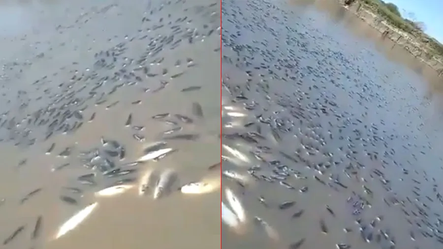 En pleno río Paraná, y por efecto de la bajante, miles de peces quedaron estancados, y tras un par de horas perecieron, dejando una alfombra sobre la poca agua que queda.
