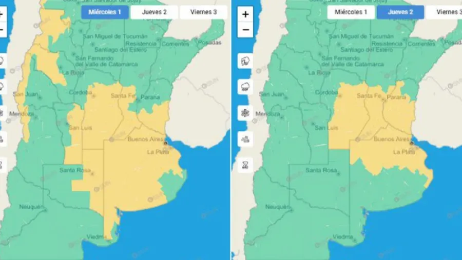 Si bien la probabilidad de inestabilidades es generalizada, se prevé que primero lleguen este miércoles hacia la zona sur de la provincia y, de cara al jueves, se extiendan hacia el centro norte.