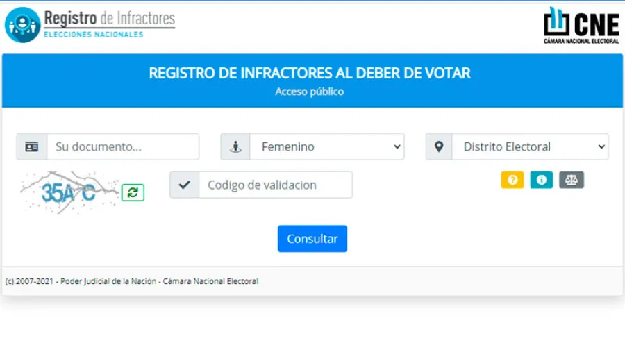 Para tramitar la justificación de la no emisión del voto, se deberá ingresar en el Registro de Infractores e indicar el número de DNI, sexo y distrito para iniciar la gestión. Luego, de acuerdo con la razón específica por la que no se pudo votar, se subirá el documento que avala la ausencia.