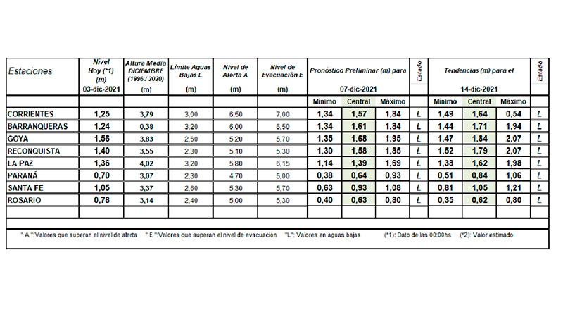 Al mismo tiempo, el 29 de noviembre el INA actualizó sus probables escenarios en lo que respecta a la altura del río Paraná para los próximos meses.