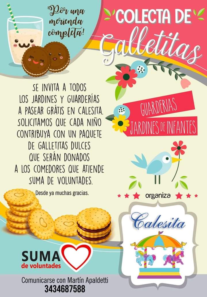 Las calesitas de la plaza Sáenz Peña, de la Costanera y el Parque Varisco convocan a jardines de infantes y guarderías, a colaborar con la organización Suma de Voluntades que asiste a comedores en diferentes barrios de la capital entrerriana. Como cada año, la invitación es para que cada niño pueda pasear gratis a cambio de un paquete de galletitas dulces.