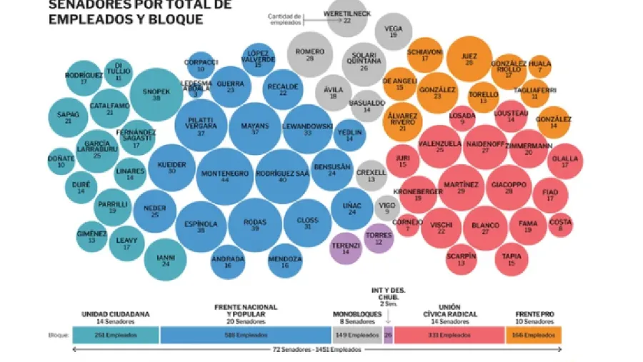 “Si bien cada senador tiene una cantidad de módulos fija, luego hay otras variables, como si es autoridad de bloque o presidente de comisión, por ejemplo, que modifican esa situación de paridad. Los senadores también cuentan con los empleados de planta, tanto permanente como transitoria, que son adjudicados a través del bloque o de la cámara. Cada senador, entonces, puede armar su propio esquema”, sostuvo Noel Alonso Murray, directora ejecutiva de Directorio Legislativo.