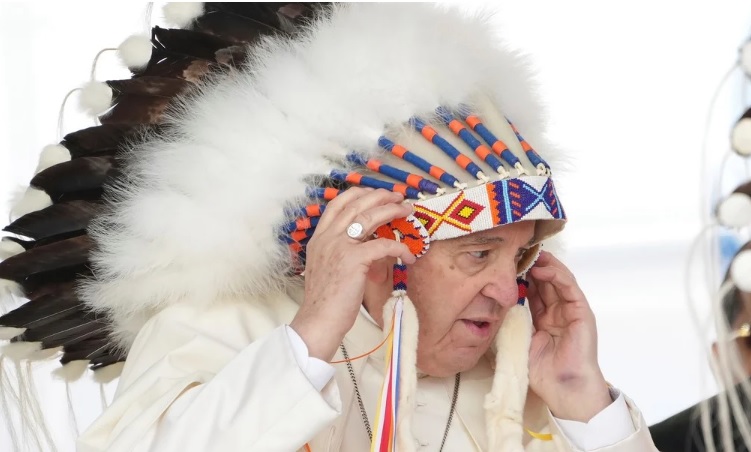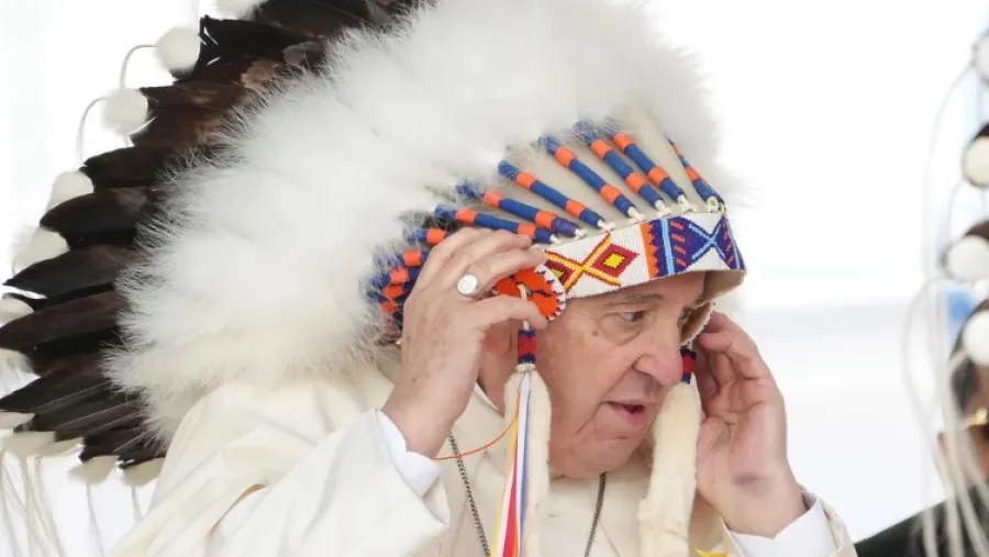 Antes de iniciar su discurso, el Papa presenció los cantos y bailes de los pueblos indígenas que llegaron al parque de Maskwacis con trajes típicos y escuchó el agradecimiento de uno de los caciques, Wilton Litllechild, quien asistió 14 años al internado de Ermineskin.