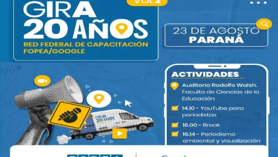 El Foro de Periodismo Argentino (FOPEA) realizará el próximo 23 de agosto una capacitación en Paraná. La jornada se realizará en el Auditorio Rodolfo Walsh, de la Facultad de Ciencias la Educación, ubicado en Buenos Aires 389.