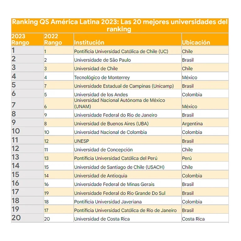 En concreto, la UBA se ubicó en la novena posición regional. Por diferencias metodológicas, a la universidad le va mejor en el ranking global -donde se ubica número 1 de Latinoamérica- que en el regional. En este informe se posiciona por debajo de, por ejemplo, la Pontificia Universidad Católica de Chile, la Universidad de San Pablo y la Universidad de Chile, que lideran la tabla.