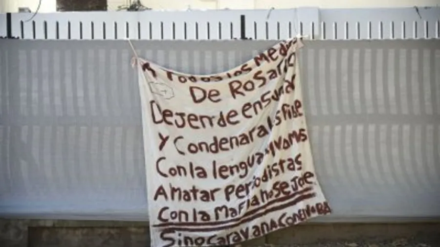El mensaje escrito con pintura roja concluye: “Si no de caravana con el Noba”. La tela fue colgada sobre un lateral del enrejado que rodea el sector del jardín del ex Canal 5, ubicado a dos cuadras del Monumento de la Bandera. Aunque existieron intimidaciones a periodistas, es la primera vez que se conoce una amenaza a los medios de comunicación en su conjunto en la ciudad cercada por el narcotráfico. Antes, los blancos de los ataques habían sido edificios judiciales.