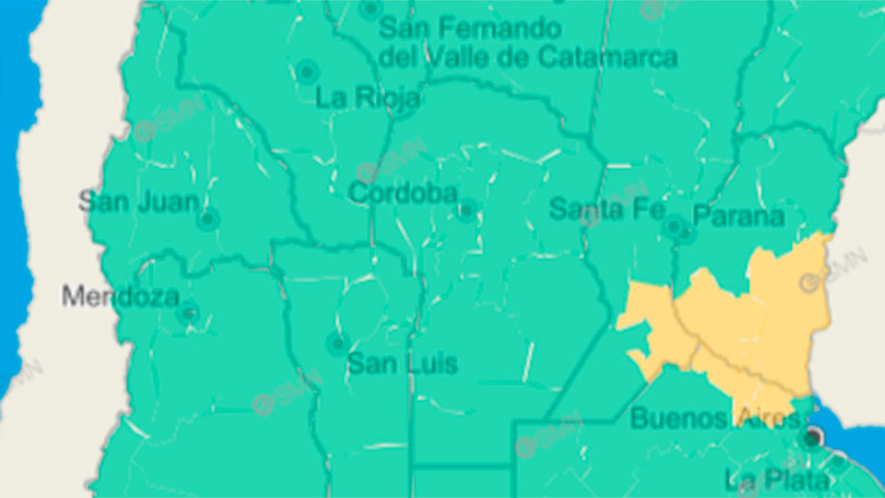 El Servicio Meteorológico Nacional (SMN) emitió un alerta para el este y sur de Entre Ríos, junto a otras provincias, como se observa en el mapa.