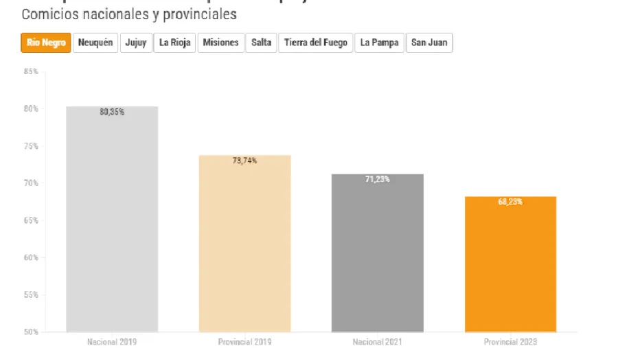 Este medio comparó los porcentajes de participación en las nueve provincias en que hubo comicios en el último mes, con la concurrencia a las urnas en la anterior elección para cargos provinciales del 2019. Todos los porcentajes de participación bajaron y se ubican entre el 68% y el 77% de los votantes de esos distritos. Al cierre de esta nota aún faltaban los números definitivos de Salta, La Pampa, Tierra del Fuego y San Juan, cuyo escrutinio definitivo comenzó ayer. La caída superó el 10% en Misiones, y el 5% en el caso de San Juan, Río Negro y Jujuy.