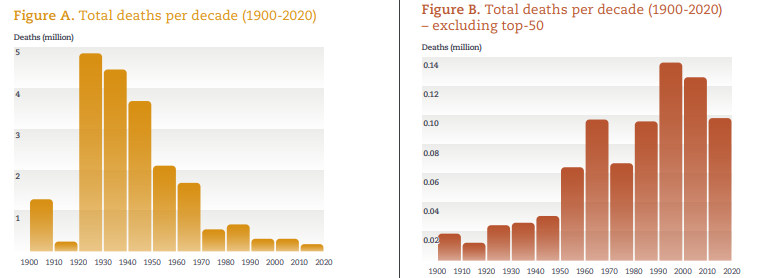 La aclaración surge porque algunos de los gráficos del informe muestran el número de muertes por desastres por década en más de 12.000 desastres relacionados con el clima. Allí se observa una disminución del 96% en la mortalidad entre la década de 1920, con 4,84 millones de muertes, y la década 2010-2020, cuando la mortalidad se limitó a 0,17 millones de fallecidos. Sin embargo, esta tendencia no se remonta a antes de la década de 1920 y, si se tomara la década de 1910 como referencia de comparación (0,25 millones de muertes), la disminución sería solo del 30%. “Tal variabilidad se explica por la ocurrencia o no de megadesastres, en los que el número de muertos puede pasar de decenas de miles a varios millones por evento. En particular, en el período comprendido entre la década de 1920 y la de 1960, hubo cinco hambrunas inducidas por la sequía, que mataron a más de un millón cada una”, detallan.