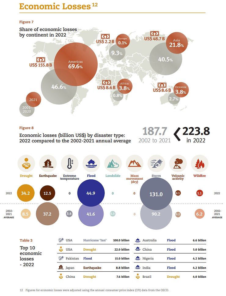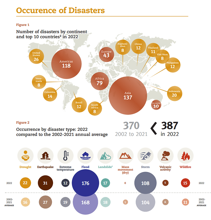 En tanto, la inundación de febrero de 2022 en Brasil mató a 272 personas, y las inundaciones en el Este de Australia en febrero y marzo costaron 6.600 millones de dólares estadounidenses. El 2022 “estuvo marcado por tres tormentas importantes, incluidas dos en Filipinas: la tormenta tropical Megi en abril (346 muertes) y la tormenta tropical Nalgae en octubre (3,3 millones de personas afectadas). El huracán Ian azotó los Estados Unidos y causó daños por un valor de 100 000 millones de dólares estadounidenses, lo que lo convirtió en el evento de desastre más costoso de 2022”.